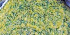 3、把酵母用温水化开,然后加入到玉米面中,制成比较稀的玉米面,再把切好的猪毛菜和小葱放进去加入盐和白糖揉匀。