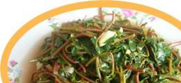 3. 将盘中马齿苋抖散,先用食盐拌匀,再加入蒜等调料,撒上芝麻,装入条盘即成。
