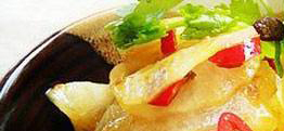 2、用葱伴侣豆瓣酱、大料(可以用刀拍一下)、小红辣椒段、白砂糖、醋、鸡精调好汁,放入挤干的萝卜片中,再加上香油略拌即可食用(或腌制10分钟,方便入味);