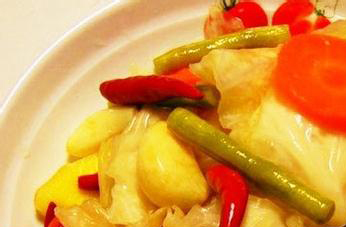4、如发现水面有一层层白色的东西浮在上面的时候,应立即除去,并加入少量烧酒和鲜姜片、大蒜等抑制杂菌生长。同时将坛内装满蔬菜,创造无氧条件即可制止。