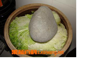 3. 加满开水,加一点盐,然后用石头压在上面去,目的就是为了防止白菜浮起来,不要让白菜露出水面,桶口要拿塑料膜盖好,与空气隔绝。放置在20天左右就可以了。