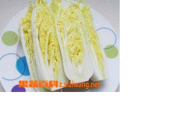 2、把娃娃菜从中间横竖各切一刀,让它变成四块,然后把它们放入锅中过水焯熟,捞出装盘备用。
