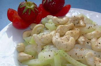 6、加入白糖、味精、味极鲜、香油、盐,撒上腰果,拌匀。