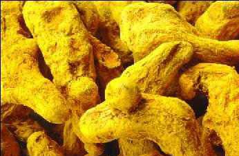 黄姜粉又叫做姜黄根粉,它有一种特殊的气味,闻起来有橘皮加上胡椒的味道,它也有特别的金黄颜色,可用来当作衣物的染剂。黄姜粉是咖哩使用的重要的香料之一,咖哩诱人的颜色便是黄姜粉的功劳。在南洋料理中,黄姜粉最常在蔬菜、豆类料理中使用到,鲜艳的颜色可刺激食慾。