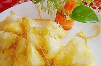 拔丝山药特色:香甜酥脆,每块山药间都可以拔出细长晶亮的糖丝。