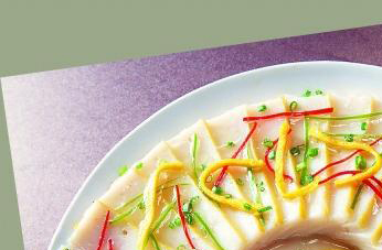 4、把鱼胶拌上方火腿粒、葱花放在深容器中,上面撒上蛋黄末,入蒸笼中旺火蒸10分钟,取出冷却,改刀成0.5厘米厚的片装盘,上桌时配一小碟米醋。