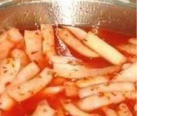 白萝卜若干 辣椒适量 烧酒适量 白醋适量 食盐适量 糖精适量 香料适量