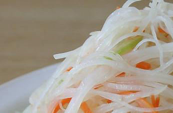 大萝卜若干 辣椒适量 烧酒适量 白醋适量 食盐适量 糖精适量 香料适量1.把大萝卜用大量的水冲洗干净后放到通风的地方凉干,然后切成丝状哦,用碗装起来。