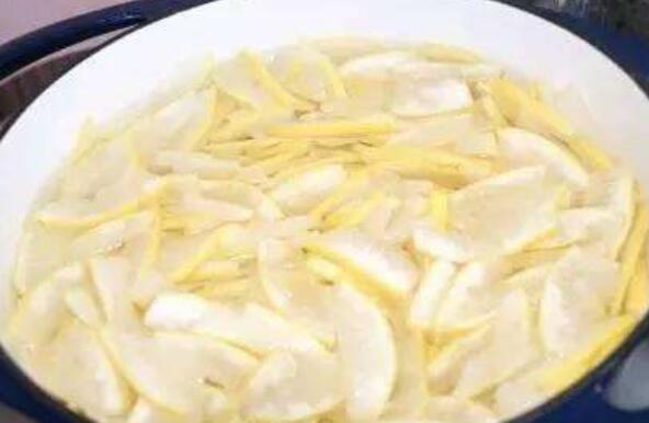 3、切成细丝以后的柚子皮不能直接入锅煮,应该先把它放到干净的盆中,放入白糖或者冰糖调匀,以后腌制腌的时候还可以放入适量柠檬汁和少量食用盐,这样也能去除柚子皮的苦味,能让柚子皮煮好以后更好吃,柚子皮腌制三四小时以后才能入锅煮。