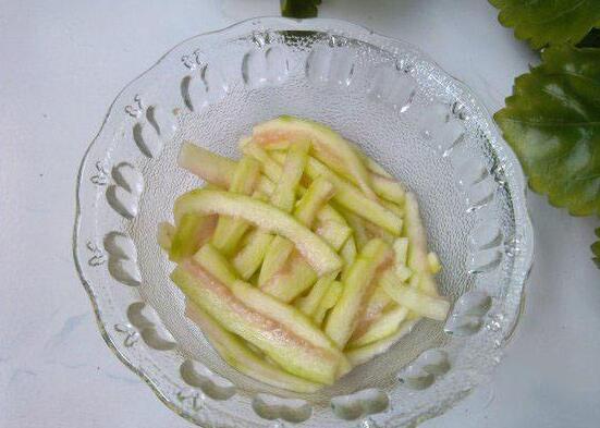 2、处理好的西瓜皮,放到干净的盘中,放入准备好的糖调匀腌制,把腌出的水分倒掉再把西瓜皮上放重物挤压去掉里面的水分,随后用无油无水的刀把西瓜皮切成条状。