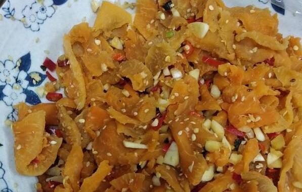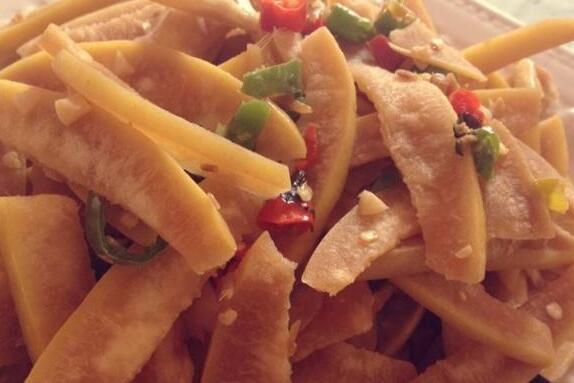5、江西柚子皮的腌制方法也不是一成不变的,它可以根据自己的需要去调整腌制的材料,如果想简单一点,则可以把柚子皮再用沸水焯,烫以后取出直接加入蒜泥生姜和适量食用盐,以及少量生抽调匀以后腌制,但这样腌出的江西柚子皮口感略涩,没有第一种方法腌出的柚子皮味道香。