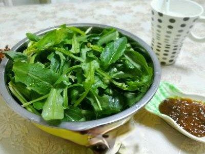 我们把所有的食材都备用好以后,锅中开始放油,先把大蒜沫煎炒一下,在放入蒲公英熬炒,放少许的生抽和盐,加入水熬煮一下,等到快要好的时候加入适量的豆瓣酱小火熬制开始不停的翻炒,一定要把多余的水分全部都敖干了,不然会放不长久。