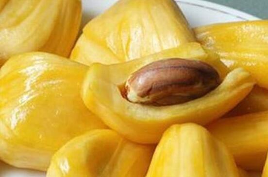 3、把菠萝蜜里面的粘液清理以后,再把菠萝蜜果肉中间的白芯去掉,这时就能得到黄色的肉包,把它们取出来摆放在盘子中可以直接吃,吃的时候还要注意,每一个菠萝蜜的肉包中都有一个果核存在,可以把这些果核收集起来,洗净以后煮着吃。
