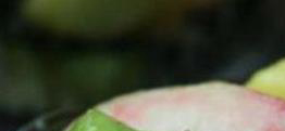 2、把准备好的青瓜用清水洗好,然后去掉外皮,再把它切成薄片,把切好的青瓜片与油桃块和紫甘蓝丝以及大杏仁碎放在一起。