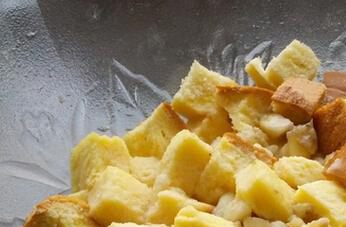 1、把准备好的面包切成小块,然后再再烤制一下,让它尽量的干一些。把香蕉去掉外皮后,切成比面包块还要小的小丁备用。