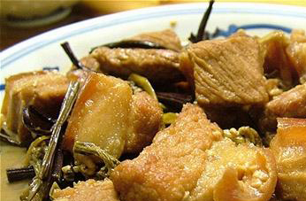 将五花肉先煎后炖,可以去除多余油份,吃起来香而不腻。但在煎的过程中,不要让表面煎成焦黄,否则炖好后的肉不够软烂。