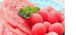 3、把取出来的西瓜球放在盘子中,摆放出自己喜欢的造型,就可以食用,这种食用方法让大家在享受美味的同时也可以增加视觉的乐趣。