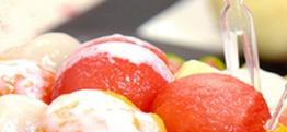 三、将瓜瓤拣出瓜子后继续泡浸。把苹果、雪梨削皮,切去两端,取出果核,用过滤水二斤浸泡。用时将瓜瓤取出,用消毒洁净毛巾吸干水份。然后荔枝、菠萝、苹果、
