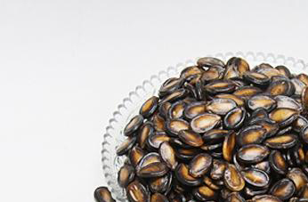 将西瓜子放入1.5%石灰水中(1.5斤生石灰加水100斤,溶解后取其上层清液)浸泡5小时左右,用手淘搓,除去子膜,洗净按10:1的比例将瓜子和酱油与适量食盐、茴香、桂皮同投入锅内,加水浸过瓜子,用旺火烧煮约1.5~2小时,然后改为小火,缓慢烘烤,让盐卤干燥,或直接放进烤房,烤炉以80摄氏度左右温度烘干。
