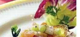 2、将糖猪板油丁掺入豆沙中拌和,分别酿入枇杷内,再在每只枇杷口的周围插上松子仁5粒,中间缀以红樱桃末,上笼旺火蒸15分钟,取出整齐排入另一盘中。