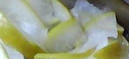 3、除苦 将橘皮捞起滤干,放入锅内,加入清水适量和明矾粉50克煮沸2~3分钟,去除苦涩味。
