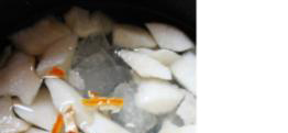 4. 将陈皮、川贝、冰糖和雪梨一同放入沸水中,注意沸水的量根据材料的多少而改变。