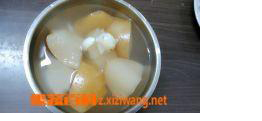 5.往沸腾的水中加入雪梨,调文火将其煮上20-30分钟,并加入冰糖。