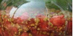 6、等黄豆自然降温后再放回到玻璃罐子中,这时就可以把抓碎后的西瓜末和西瓜汁加入进去,加入时要让西瓜汁没过里面的黄豆,搅拌后密封放在温暖的地方进行发酵,过一个月以后,西瓜酱就会发酵完成,可以取出食用了。