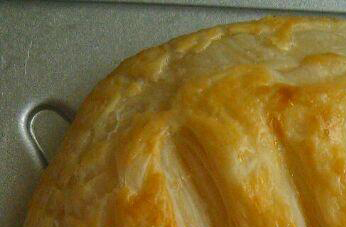 11、将条装飞饼皮交叉覆盖于苹果馅上(我赶着出门没有编,直接铺上的,编了更好看)。