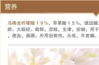 乌梅别名酸梅、黄仔、合汉梅、干枝梅,经烟火熏制而成。若用青梅以盐水日晒夜浸,10日后有白霜形成,叫做白霜梅,其功效类似,宜忌相同。乌梅中含钾多而含钠较少,因此,需要长期服用排钾性利尿药者宜食之;乌梅中国含儿茶酸能促进肠蠕动,因此便秘之人宜食之。乌梅中含多种有机酸,有改善肝脏机能的作用,故肝病患者宜食之。乌梅中的梅酸可软化血管,推迟血管硬化,具有防老抗衰作用。