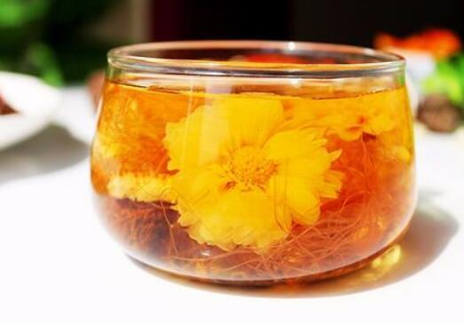 2、每次想冲泡陈皮菊花茶的时候,可以把它们放在一起混合去,5~6克直接放在干净玻璃杯中,放入几块冰糖,加入适量开水浸泡,泡好以后降温就能饮用,大家只要按上面介绍的方法去做就能做出好喝的陈皮菊花茶。