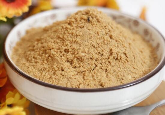 3、用小火继续慢慢翻炒,炒匀以后放入准备好的十三香和食用盐,继续用小火翻炒翻炒到锅中的面粉变为比较重的黄色以后关火取出降温,等它晾凉以后,装入的可以密封的容器保存,想喝五仁油茶时可以把它放在碗中加开水冲调后食用。