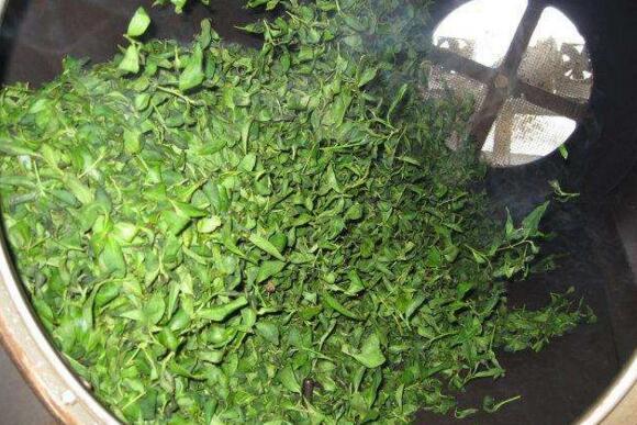 3、锅中的新鲜茶叶在揉搓完成以后,要用小火继续翻炒,这时锅的温度大约在90~100度之间,如果锅的温度过低或过高,也会影响绿茶炒好以后的颜色,锅中茶叶在小火状态下翻炒,30分钟左右就能炒好,取出以后降温就能得到炒好的绿茶。