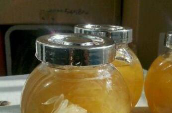 4、把柚子果肉用料理机打碎加冰糖腌制半小时,然后入锅熬制,熬的时候要把柚子皮丝一起入锅,熬到果肉粘稠柚子皮呈透明状以后关火,降温以后加入好准备好的蜂蜜调匀,直接装到了玻璃的瓶中密封保存。想喝蜂蜜柚子茶时直接取出适量用温开水冲调就可以。