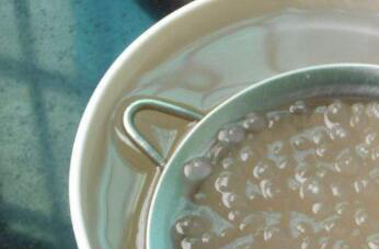 4、关火以后心里不能急着取出,应该让他在热水中浸泡,泡到中间的白点消失,这时西米才是完全煮好,它弹性十足口感特别好。