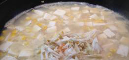 第七步:粥熟热后放入蟹肉片和芹菜丁,豆腐丁大火烧开即可。