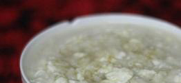 第六步:将锅中的麦片鸡蛋粥倒入碗中,等到温度下降后就可以放入蜂蜜了。