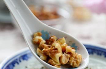 第七步:将已经掰碎的核桃仁放在粥的上面,即可准备食用了。