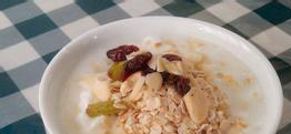 第一步:将牛奶,葡萄干和燕麦片放入碗中。