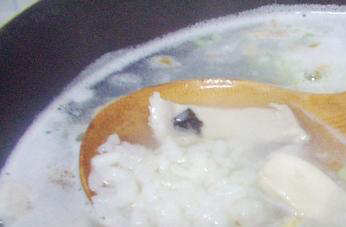 第五步:粥开花煮好后,将香荽末放入粥中,再加入腌制的虱目鱼片,添加入盐后调味。