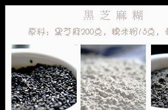 首先买来的黑芝麻要先淘尽杂质洗净,沥干水分后再放入烤箱重新烘烤干。家里没有备烤箱的则可以用锅子炒制黑芝麻,记住炒制黑芝麻不能用大火,否则黑芝麻容易发苦发焦。完成黑芝麻炒制程序后就将黑芝麻打成粉末封存待用。黑芝麻要能熬成糊状则需要糯米相互搭配,同样对糯米粉进行炒制。