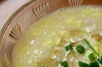 5、把制好的燕麦鸡蛋粥出锅装碗以后再加入准备好的香葱末和少量的香油进以及适量的食用盐调匀以后即可食用。