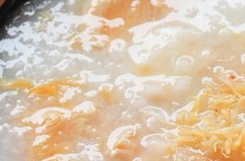2、把梗米清洗干净,加入鸡汤和处理好的瑶柱,最后再把切成片状放入进去,用大火烧开以后,再转成小火,慢慢熬制,大约四五十分钟锅中的粥就能熬好,熬好以后加入准备好的葱末进行调味就可以。
