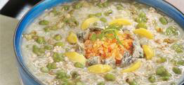 4、肉碎绿豆粥:肉碎腌好,一开始就加进米和绿豆中同煮,煮完调味即可。以虾干、炸鱼皮和熟白果伴吃可增添美味。