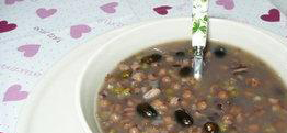 美肤杂粮粥,原料:黑豆14g,黑米14g,小米34g,绿豆34g,红豆34g,薏仁34g,糙米34g,芡实34g