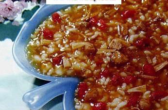 枸杞子味甘,性平,入肝、胃经,有滋肾补肝、益精明目的功能。黄花菜含有18种氨基酸,其味甘,性寒,入心、肝经,有安神除烦、凉血明目、通利小便的功能。鸽肉含有丰富的蛋白质,脂肪含量少,其味甘,性平,入肝、肾经,可补肝肾、益气血。女性常食鸽肉可调补气血,提高性欲。三者在此组合,配以具有益脾和胃、除烦渴的大米烹制成粥,适宜于更年期女性心烦不安、头晕目眩、视力减退、体弱神衰,月经紊乱、气短乏力、性冷淡者食用。