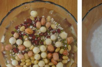 1.将糯米,绿豆,苡米,苕实浸泡一晚, 洗净在人仔煲熬至材料软,如图.起码一两个钟吧.熬好后放盐放糖自便.