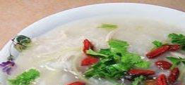 3.米饭用热水浸洗片刻,沥干后盛入锅中,加入高汤煮滚,放入猪肉末及牡蛎,用小火熬至熟,下入盐调好味,再加入芹菜末及冬菜末,略煮片刻,即可盛起食用。
