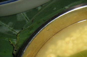 2.临熟时将鲜荷叶洗净撕成4部分覆盖粥上,焖约15分钟,揭去荷叶,看到粥成淡绿色,把已黄烂的荷叶过滤去,只剩下米粥盛碗。