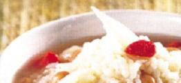 将枸杞子、花生与粳米放入砂锅内,加水用急火烧至沸腾,改文火待米开花、汤稠时,撒上鲜百合,停火焖5分钟即成。